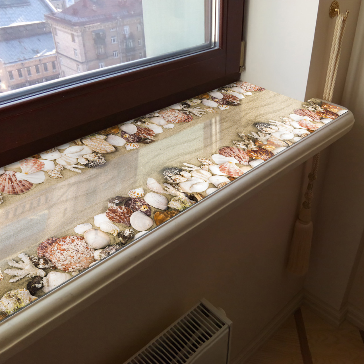 Покриття для підвіконня, м'яке скло з фотодруком Мушлі в піску 35х100 см ПО-tx376